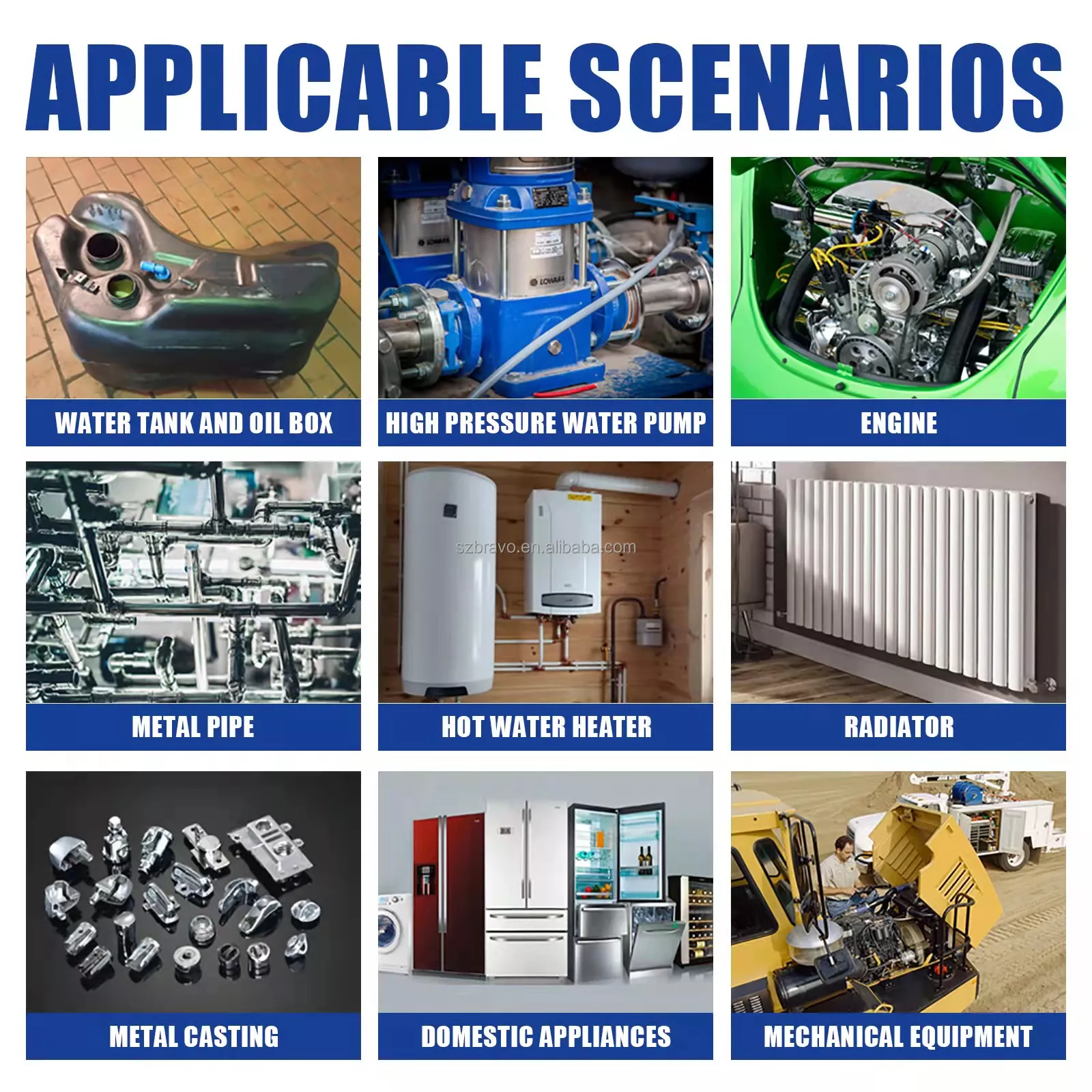 Ефективен адхезивен агент: Разработен като алтернатива на заваряването с горелка, той осигурява здрави и дълготрайни ремонти на метали и множество други повърхности. Той ще слепи почти всяка чиста повърхност, която не съдържа мръсотия и масло.
